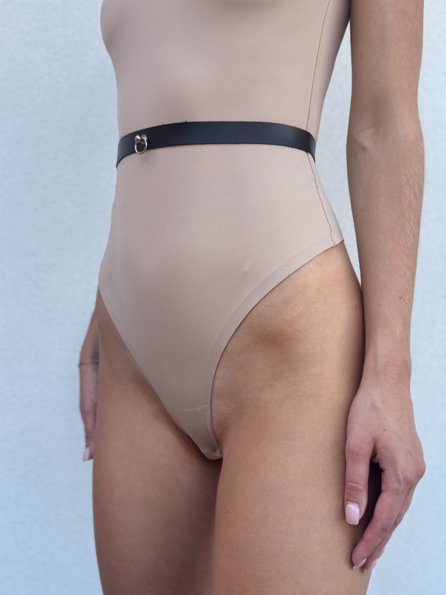 - Belt length: 65 cm- Belt width: 2 cm- Rivets: 9 mm- Central ring: 1.7 cm diameter- Lingerie-style clasp: 2.5 cm- Material: Genuine leather- Color: Black- Style: Minimal / Everyday / Layering accessory