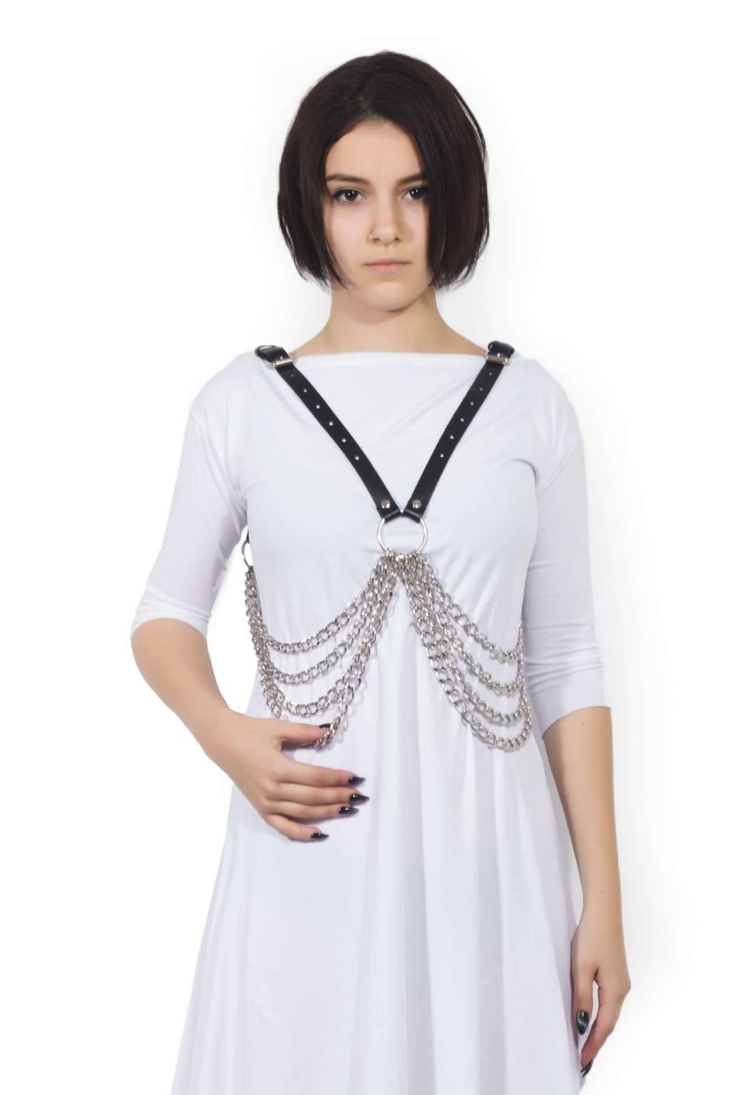 corpetto con massicce catene di ferro e cinturini in vera pelle. Puoi indossarla all'indietro o intorno alla vita come una gonna peplo. Morbida vera pelle. Fatto a mano. Prodotto in Italia. La dimensione è regolabile con cinturini con fibbia e si adatta a qualsiasi ragazza.